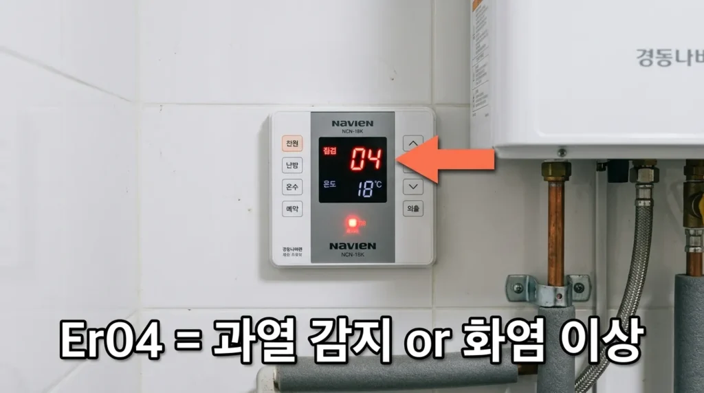 경동나비엔 가스보일러에서 Er04는 과열 감지 이상 또는 화염 감지 이상 신호로, 보일러 내부 온도가 비정상적으로 높아지거나 연소 상태에 이상이 감지될 때 안전 차원에서 자동 작동 중단되는 코드예요.