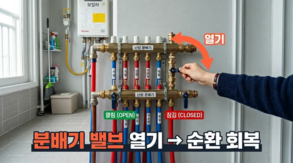 - 2단계: 집 안 난방 분배기(보통 베란다·복도에 위치) 확인 → 잠긴 밸브 모두 열기