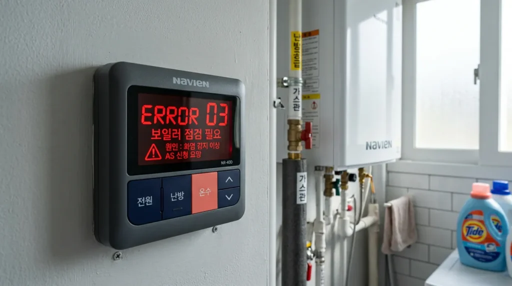 경동나비엔 보일러에 에러코드 03이 뜨면 “실화 불량” — 점화 자체가 안 된다는 뜻이에요.