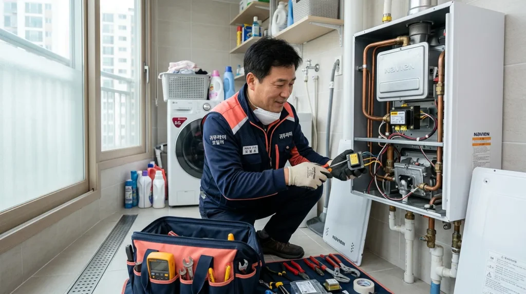 보일러 내부 작업은 자격증 있는 기술자에게 맡기세요. 가스 긴급 상황 시 한국가스안전공사(1544-4500)로 신고하세요.